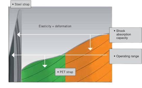 Polyester strapping are characterized by a very consistent tensile strength and a very high elongation. Characteristics that are most decisive for a safe strapping method. Unlike strapping made from steel, Polyester strapping have a high elongation and absorb shocks and impacts during transportation and handling far better than steel strappping. The excellent elongation features allow the substitution of steel strapping for the same application with a Polyester strap having a lower breaking strength.
